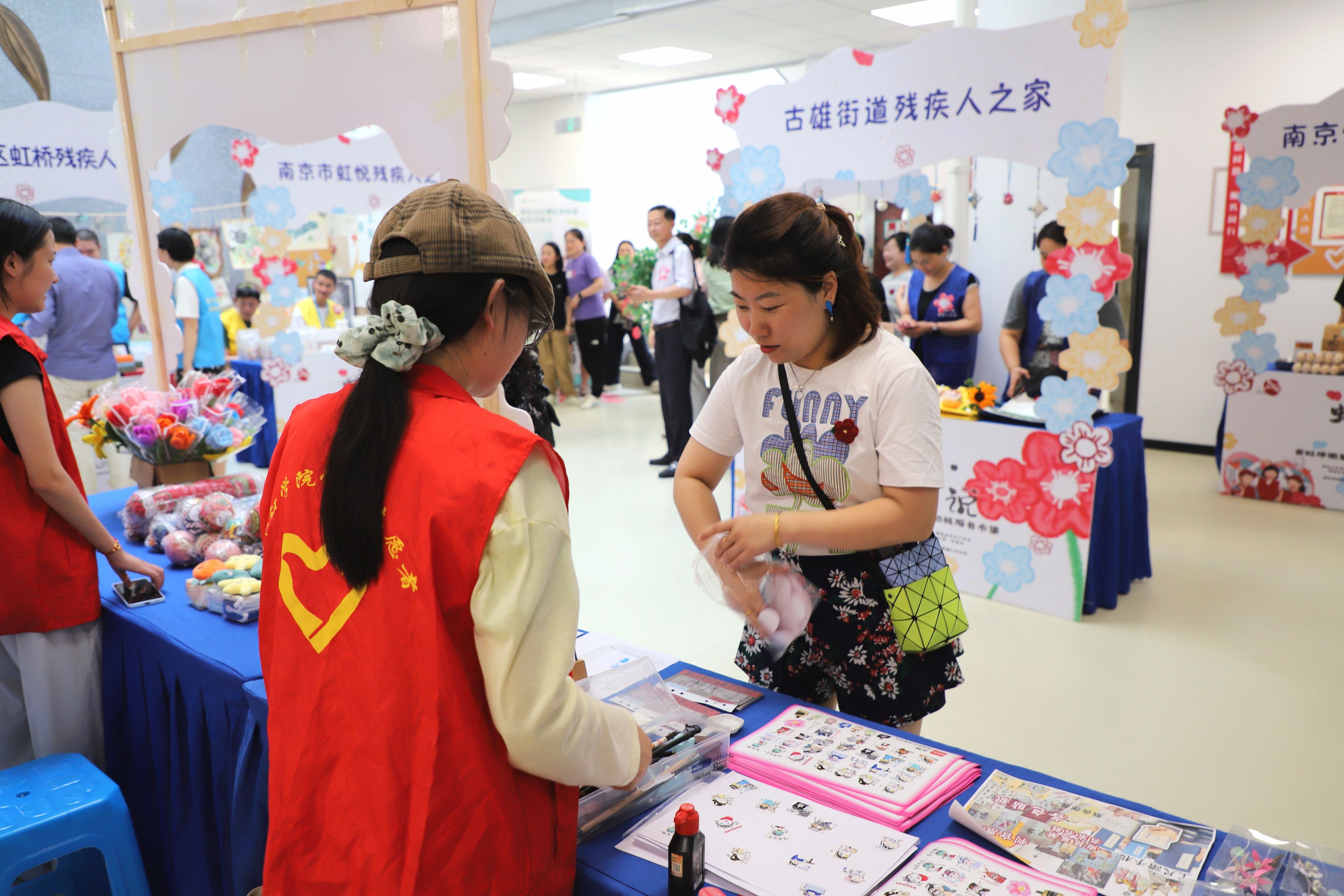 活动中,新伟德国际1946研会师生志愿者在义卖区精心布置摊位,展示由残疾人亲手制作的缠花发簪、宋锦发夹等手工艺品。他们在摊位上热情介绍手工艺品的制作历程,分享残疾人的工作状态及他们对生活的热爱,并细致解答市民们的咨询,吸引众多市民驻足选购。同时,师生团队在摊位现场挥毫泼墨,将书写寓意美好的书法作品赠予市民,以实际行动诠释南工大志愿服务精神,用青春力量书写了温暖的故事,传递了浓浓的公益温情。